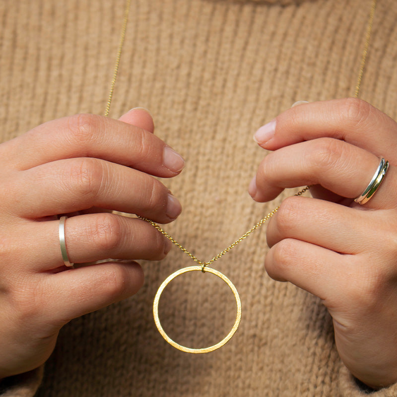 Ein schlichter großer Ring macht diesen dezenten Halsschmuck zu einem außergewöhnlichem Schmuckstück und Eyecatcher.